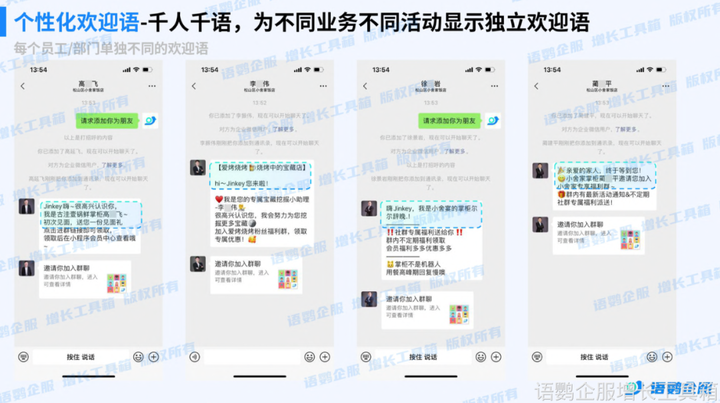 其实这种引流方式就是语鹦企服当中的「个性欢迎语」功能,欢迎语可动态带上客户的昵称,能让客户感到被重视和被欢迎。首次打招呼内容也可以自主编辑,链接、图片、小程序等多种形式随意添加,所以也不用担心打招呼内容会被受限啦~