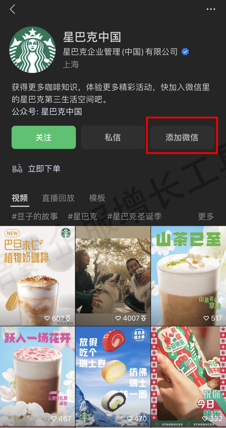 客户主动添加好友之后,要做出快速通过的动作,不然时间久了很容易错过邀请客户进入社群的最佳时间。比如上图中的星巴克视频号主页就设置了一键添加好友通道,在点击添加好友后,星巴克的熊店长小助手会自动通过好友,且能自动弹出欢迎语并拉你进入群聊。