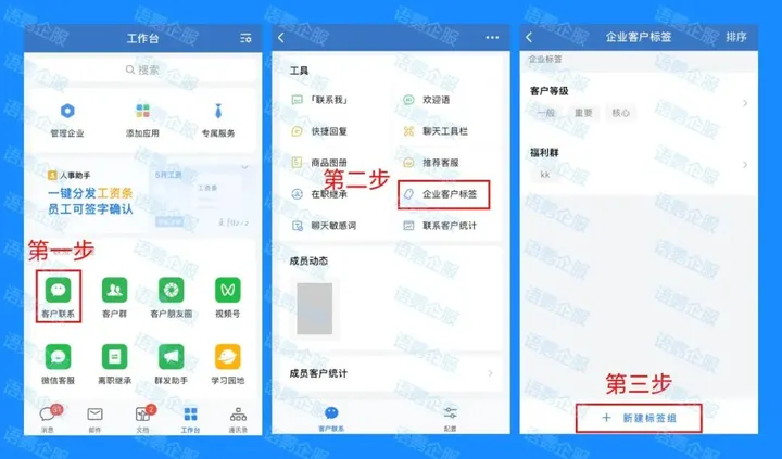 2. 手机端登录:在工作台界面选择「客户联系」-「企业客户标签」-「新建标签组」