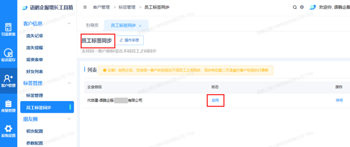 设置好客户标签组后,员工就可以用创建好的标签组为客户添加对应的标签。之后登录语鹦企服后台,选择「客户管理」-「员工标签同步」选择对应的企业微信,操作启用即可同步。