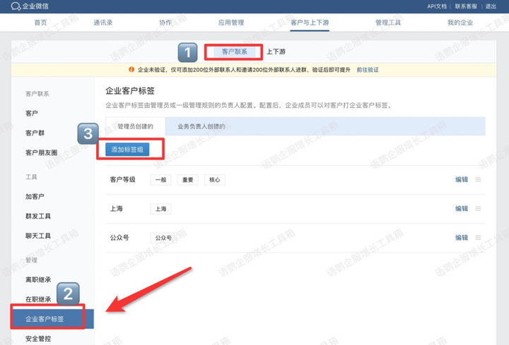 1. 登陆网页版企业微信:点击「客户联系」-「企业客户标签」-「添加标签组」