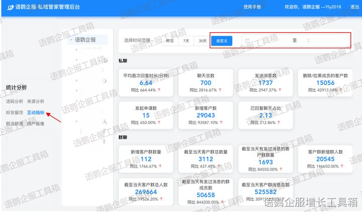 这时我们可以使用语鹦企服增长工具箱中的【互动指标】功能,不仅可以查看整个企业的总数据,还可以单独查看单独某个部门或单独某个员工的具体数据。点击顶部日期设置,可选择数据查看范围,数据还可永久储存,随时都可调取数据进行分析查看,极大节省收集统计时间。