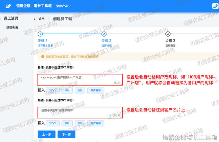 为员工创建专属的活码,可设置一对一备注,如:某店,当用户扫码后,添加粉丝名字即可自动备注,无需人工手动操作。每位员工可以根据各自服务的特点,定制个性化回复与引导内容,吸引更多目标用户添加好友。