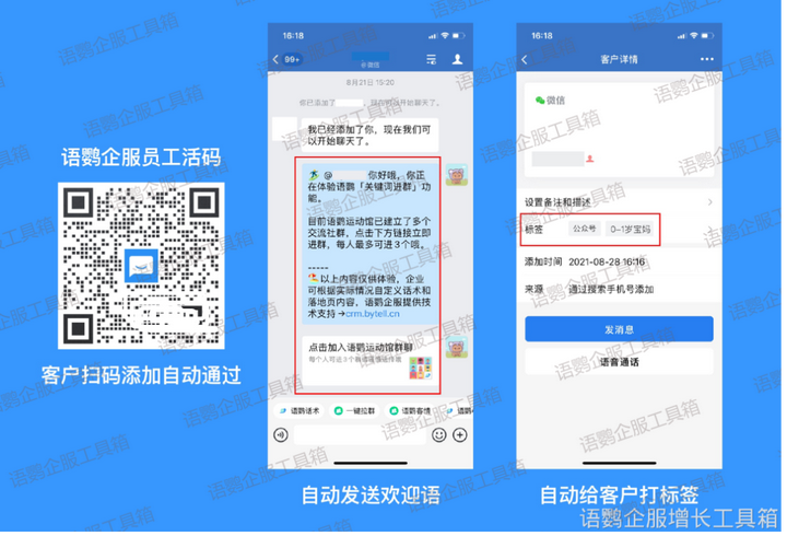 只需使用语鹦企服【员工活码】功能,即可解决以上所有问题,不仅可以自动通过好友申请,实现秒速自动回复,提升用户体验,还可对用户进行一对一精准自动标签,区分客户来源,提高服务质量自然加粉率也会增高。