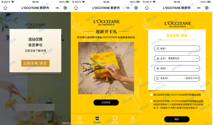 通过建立会员制度,鼓励用户注册成为会员。让通过用户注册、订阅等方式收集用户的基本信息和联系方式建立用户数据库。比如我们常见的线下门店,如百果园会员,中百会员通过绑定手机号注册会员,再比如欧舒丹的线下门店也会通过邀请顾客扫码小程序注册会员获取开卡礼来吸引用户留资注册会员,是一种典型的私域会员获取方式。