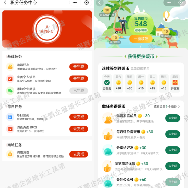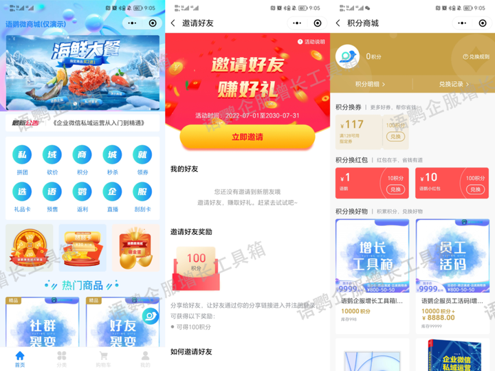 通过小程序商城呈现私域会员成长体系是当前最为主流的玩法,品牌可使用【语鹦微商城】承接私域会员,内置会员中心、积分任务体系、积分商城等板块,可面向会员设置拼团、秒杀、砍价、返利、“邀请有礼”裂变等多种专属私域活动,并分享到会员社群内促活、转化。