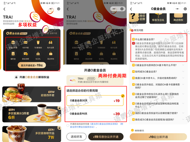 此外,还推出“O麦黄金会员”付费会员制,可享受超值四件套、麦满分3件套六折、咖啡饮品7折、全时段0元外送费、福利金、惊喜生日礼等,且开通金额不高(19元/30天,39元/90天)。麦当劳拥有数量庞大的熟客群体,以消费力中等的上班族、学生党居多,十分适合“低门槛+长期享折扣”的付费会员制。用户一旦开通,秉承不浪费的原则也更愿意前往门店消费,有效提高复购率。