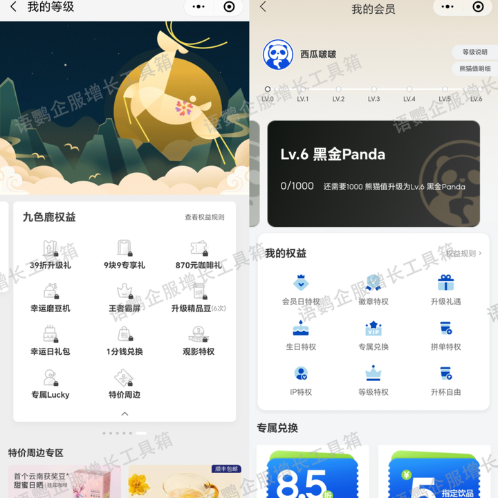 成长型私域会员体系基本遵循“完成任务领积分”的规则玩法,用户通过“完善个人资料”、“授权登录小程序”、“关注公众号/视频号”、“添加福利官”、“消费购物”等行为获得积分,积分越多会员等级越高,享受特权越多。但在此基础上,品牌可以结合自己的产品定位、营销理念以及目标群体创新符合品牌特色的会员积分玩法。