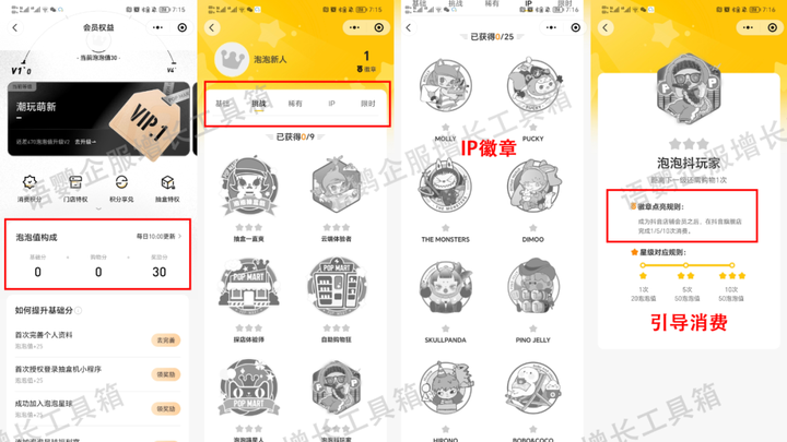 例如潮玩品牌——泡泡玛特以“泡泡值”代替积分,泡泡值由基础分、购物分和奖励分组成,除了常见的任务外,奖励分以点亮徽章的形式呈现,用户通过完成小程序抽抽盒、在不同平台(小程序、抖音、天猫等)下单满X次/X元、购买对应IP盲盒等任务即可成功收集徽章。对于酷爱收集潮玩的年轻消费者而言,这种玩法趣味性和仪式感都更强。