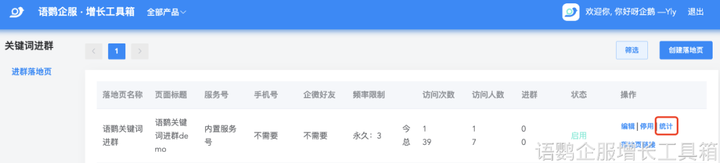 企业微信目前无法实现让用户根据关键词进群的功能,商家可以通过链接语鹦企服的关键词进群功能来实现。不仅可以帮助商家邀请用户和进群,后台还可以看到完善的落地页链接数据分析。商家进入关键词进群落地页列表页面,点击[统计]即可可查看:每日访问人数、次数和进群人数,并支持导出明细报表。