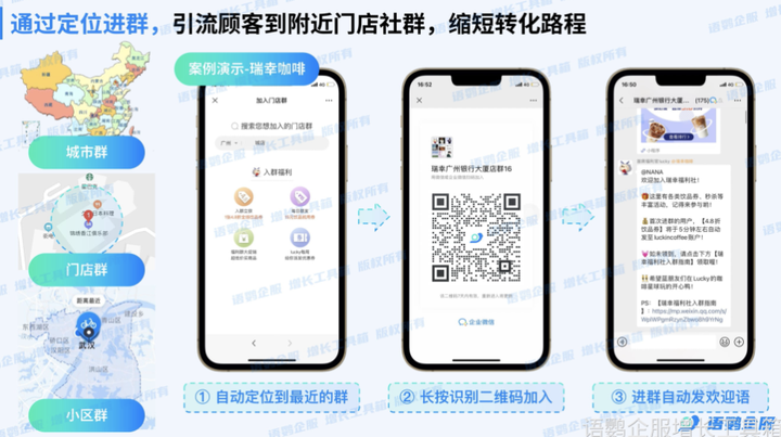 对于多门店的企业整体运营的关键是网格管理,需要根据门店密度,划分不同区域,引导对应区域内的客户加入群聊。企业微信目前不支持根据客户定位进入群聊,企业想实现精细化管理上是有一定难度的。针对此情况可以采用语鹦企服的定位进群功能,为多门店的企业在进行区域性线上转线下的私域流量运营时带来极大的便利。