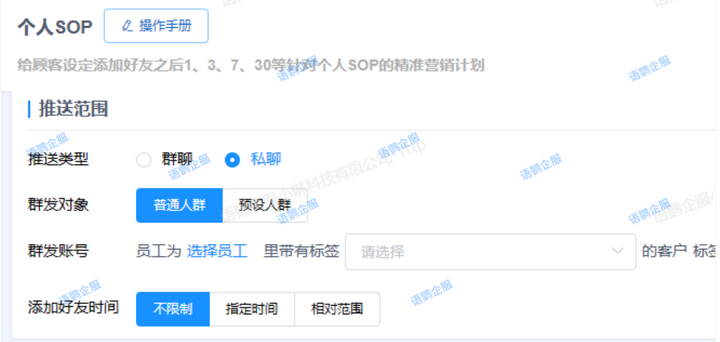 「个人SOP」功能是指企业向个人用户群发个性化消息,如定制欢迎语、新人券、活动消息等,「个人SOP」功能支持企业按照客户的添加时间来设置回访,并对不同用户个性化地设置群发内容,并对推送的周期和范围进行设置,帮助企业实现精准营销和快速回访,增强客户体验感和满意度。