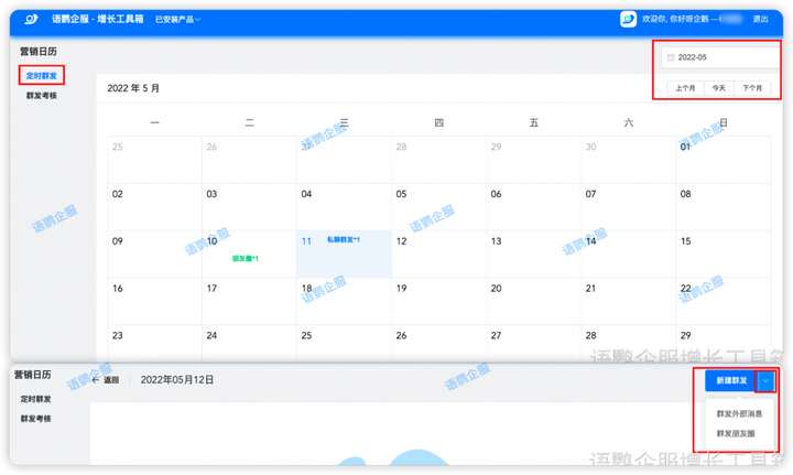 「定时群发SOP」功能是指企业定时向所有用户群发消息,如入群邀请、促销活动、活动券等等,企业只需要在语鹦企服后台找到「定时群发」功能,选择需要设置定时群发的日期即可新建定时群发任务,并且可以提醒员工及时确认定时群发的消息。「定时群发SOP」功能可以帮助企业和用户保持持续地互动与关注,提供及时的产品信息、活动通知等,建立稳固的客户关系,促进品牌认知度和忠诚度的提升。