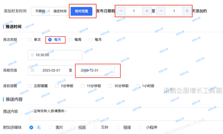 企业可借助语鹦企服「定时群发」功能,给客户设定添加好友后1、3、7、30天针对个人sop的精准营销计划,自动推送指定内容。这样就可以避免给客户造成刷屏的厌恶,又可精准营销,提醒客户复购。