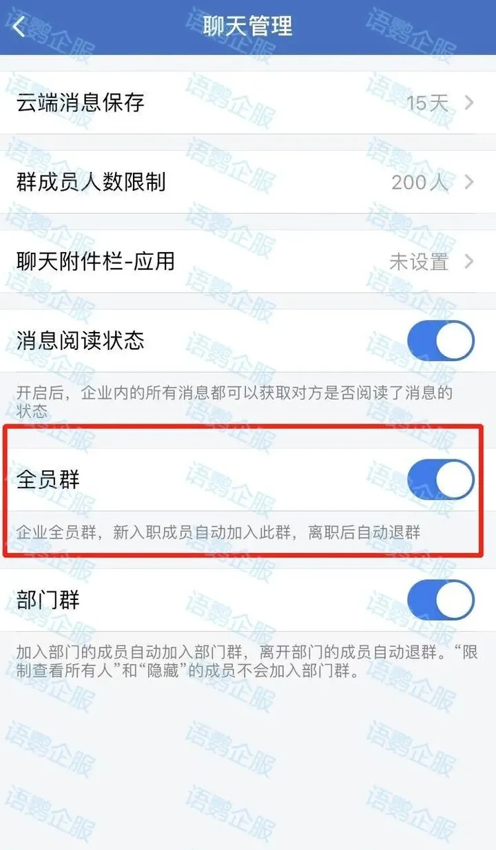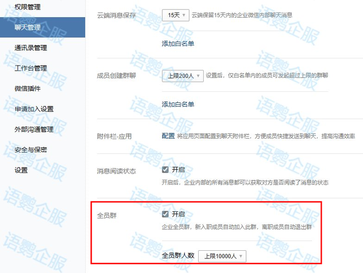 第二种是通过手机端进入后台,找到「管理企业」,选择「聊天管理」,点击开启「全员群」即可。