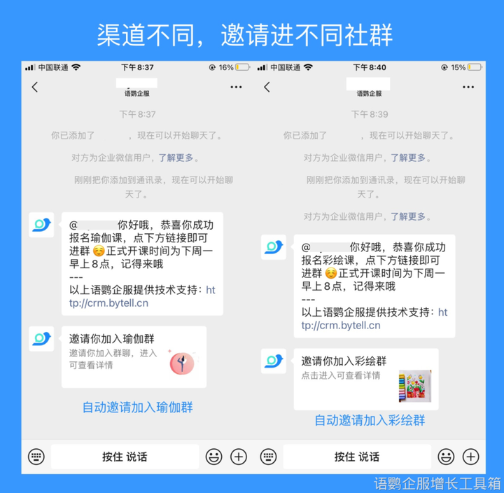 结合语鹦企服的「员工活码」功能,企业还可以给同一员工设置活码,在客户加好友后,自动打上特定标签,发送特定的欢迎语,还可发送不同的入群邀请,实现差异化运营和渠道统计。