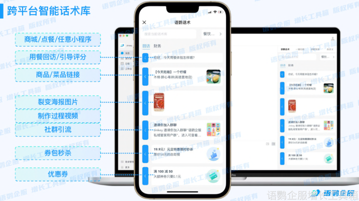做好产品服务和内容精准触达,能帮助企业有效吸引客户购买。企业可借助语鹦企服的「跨平台话术库」来给客户提供精准有效的内容。企业只需要配置一次,即可分配到全员,在全平台可用,高效分发。员工也可以自行设置独立话术分组,方便个人使用。