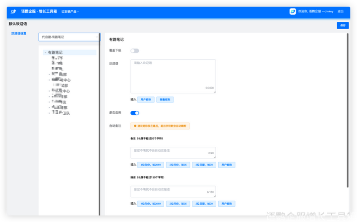 同时,企业可以通过语鹦企服的「个性欢迎语」功能实现添加好友之后的自定义自动回复内容,无论是图片、小程序、链接等多种形式都支持插入到内容中。