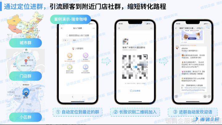 语鹦企服「定位进群」功能可帮助企业根据区域划分,将客户自动分配到对应区域到门店社群,实现千店千群的精细化运营。