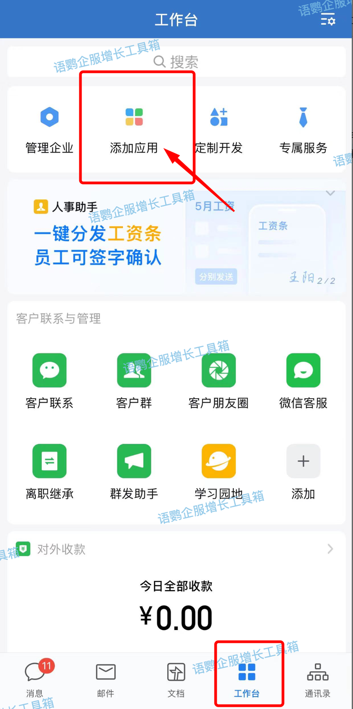 首先,企业微信管理员要在企业微信管理后台配置需要的功能,然后员工可在企业微信app上「工作台」使用功能。另外企业管理员还可以点击顶部的「添加应用」按钮,添加更多第三方应用,比如语鹦企服,帮助企业做好私域运营增长。