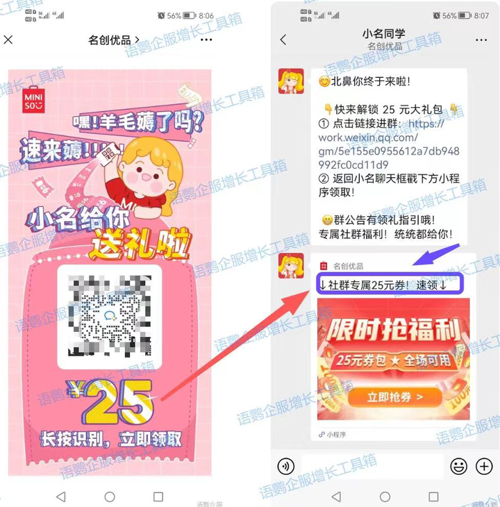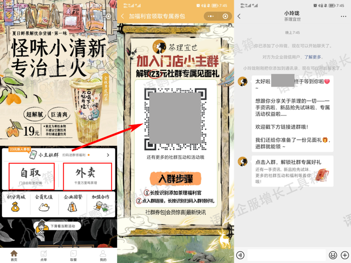 企业可利用小程序商城,将线下客户导流到线上,在线下门店/活动现场物料,引导客户在小程序下单、扫码点餐或通过微信公众号推送注册成为门店会员/参与活动等方式,在客户扫码后弹出或跳转嵌入语鹦企服「员工活码」的页面,说明加好友/进群的福利或功能,实现线下客户沉淀私域。
