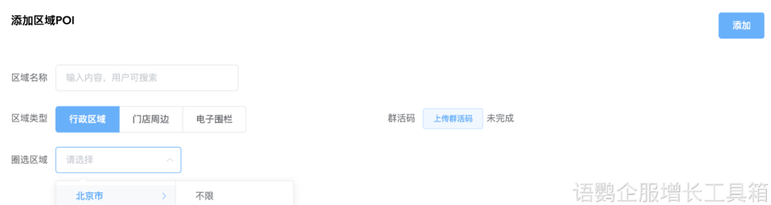 企业可借助企业微信第三方服务商——语鹦企服的「定位进群」功能实现精准运营门店周边流量。在语鹦企服的「定位进群」功能里,点击「创建活动」填写相关信息,在「区域设置」一栏,可以选择「+添加POI」自定义设置「门店周边」/「电子围栏」,圈定门店周边一定距离半径,以此获得精准客流。