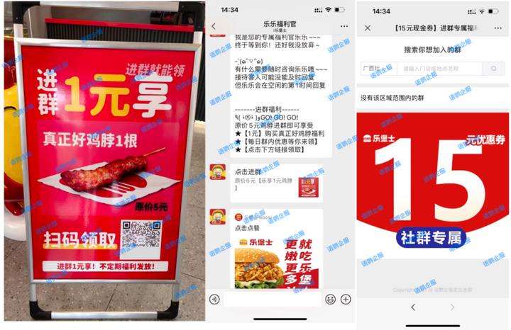 乐堡士在门店显眼处摆放进群有福利的展示架,以“进群1元享真正好鸡脖1根”为诱饵,吸引客户扫码加好友,自动推送进群链接。当客户点击进群链接后,系统根据最近的门店自动定位弹出周边门店群,从而确认进群的都是周边门店流量,实现千店千群精准化管理。
