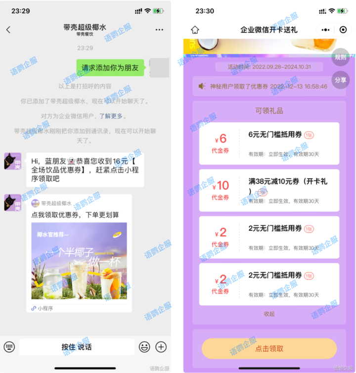 语鹦企服员工活码的自动欢迎语功能,可根据不同部门、不同员工设置不同欢迎语并且欢迎语可动态带上客户昵称、销售呢称,更真实。当客户添加上员工后,可以自动发送后台提前设置好的小程序卡片,比如新人加好友直接送优惠券,这样做既省去了员工挨个发送的麻烦,又可以在第一时间触达到客户。