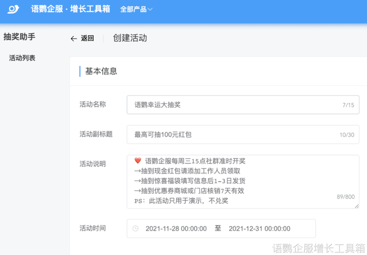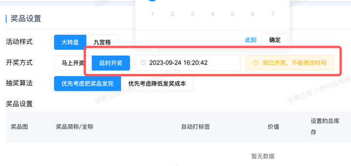 另外,企业想要在某个时间统一开奖,也可借助语鹦企服的「大转盘抽奖」功能实现,设置「延时开奖」,比如在周末发起抽奖,在周一中午统一开奖。