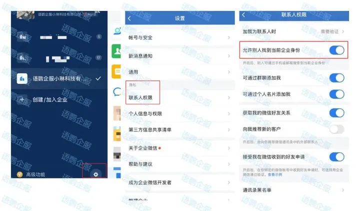 登录企业微信,在企业微信左上角头像点开找到【设置-隐私】中确认已经打开【允许别人找到当前企业身份】按钮。同时还要保证微信已经更新到最新版本。开启后微信上通过手机号添加好友时就可以搜索到企微账号从而添加企微。