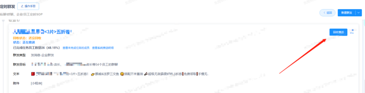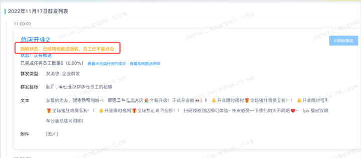 点击回收后,尚未确认群发的员工将无法再执行群发操作,这个举措是为了避免在活动结束后,员工误操作并重新发送之前未完成的消息对客户造成困扰。