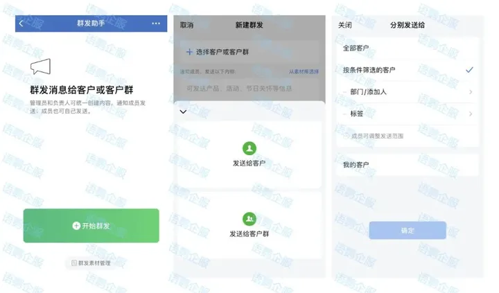 语鹦企服的定制群发功能也支持管理员自定义筛选指定员工和指定的标签用户进行群发和接收消息。