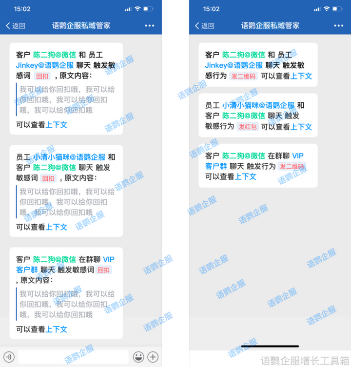 除了能看到员工撤回不想给其他同事看到的消息之外,语鹦企服「会话存档」功能还提供聊天记录质检、敏感词监控等功能,比如员工在服务客服期间,提及了敏感词、违禁词等,都会触发敏感词提醒,将消息发送给监管成员,以便管理员可以第一时间采取措施,避免员工私下建联损害公司利益,造成重要客户流失等情况。