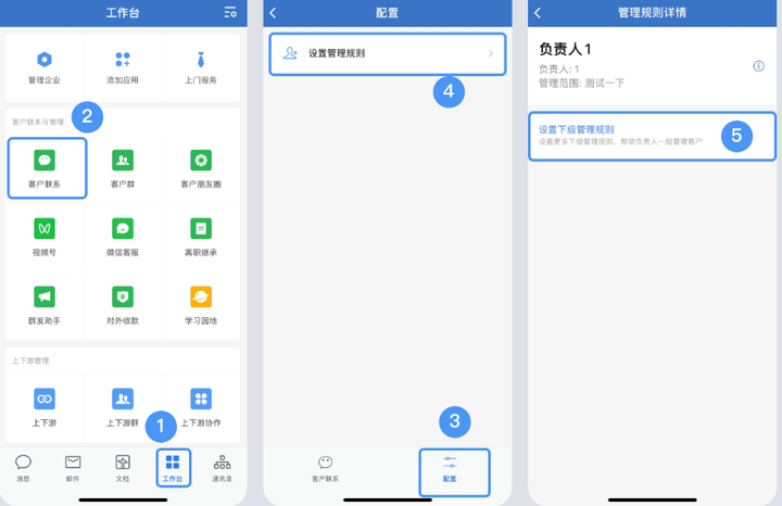 移动端:在移动端的企业微信应用中,超级管理员可以进入「工作台」-「客户联系」-「配置使用范围和管理规则」-「配置管理规则」,在管理规则中添加业务负责人、指定负责人的管理范围和管理权限。