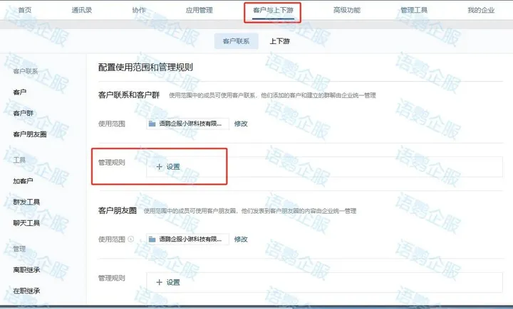 Web后台:超级管理员也可以在Web管理后台,进入「客户联系」-「配置」-「配置使用范围和管理规则」中设置业务负责人,以协助分管成员添加客户。