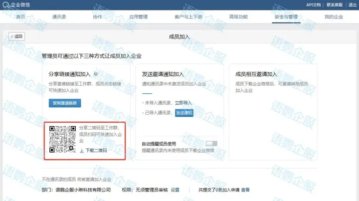 b、PC端:在「管理后台」-「管理工具」-「成员加入」-「分享链接/二维码通知加入」,链接和二维码的有效时间是365天,企业微信移动端成员加入二维码是7天有效期。