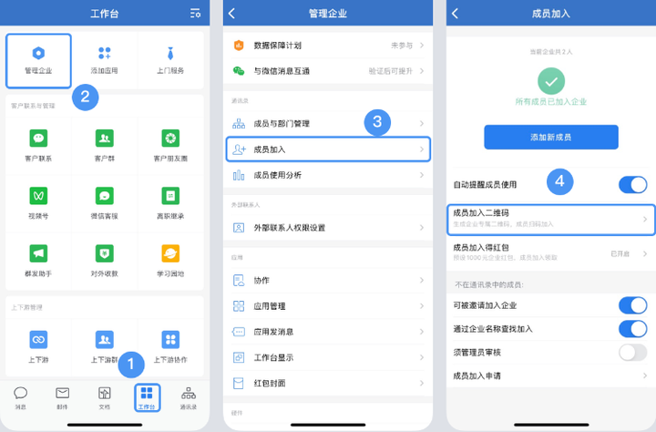 a、手机端:在「手机端」-「管理企业」-「成员加入」-「成员加入二维码」,保存该二维码,可以直接分享至同事群,也可以打印出来,放在公司前台。