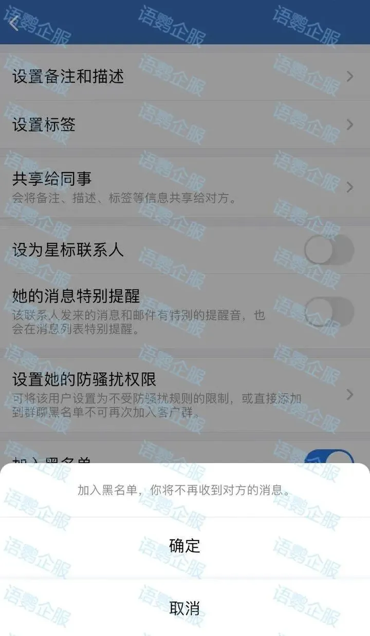 c、在弹出的菜单中,打开「加入黑名单」选项,点击确认即可。