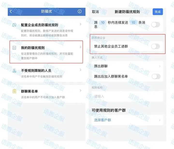 打开企业微信App,在「工作台」点击「客户群」-「防骚扰」-「我的防骚扰规则」页面,「新建」我的防骚扰规则,打开「禁止其他企业员工进群」按钮,并选择「可使用规则的客户群」,为客户群配置防骚扰规则。