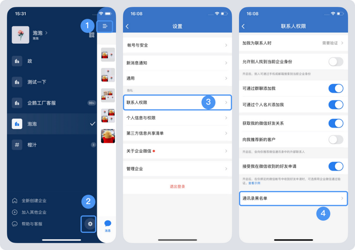 被加入黑名单的联系人将无法收到该企业的群聊邀请,也无法在群聊中发言。如需解除黑名单,只需在联系人详情页面中关闭「加入黑名单」选项即可。也可以【手机端->左上角“三”->设置->联系人权限->通讯录黑名单】,找到对应联系人,点击右上角三个点,取消加入黑名单。