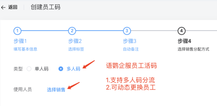 语鹦企服是一款强大的工具,其中的「员工活码」多人码功能能够派上用场。这个功能作为永久活码不受人数限制,并可以关联多个员工号,实现无限引流。