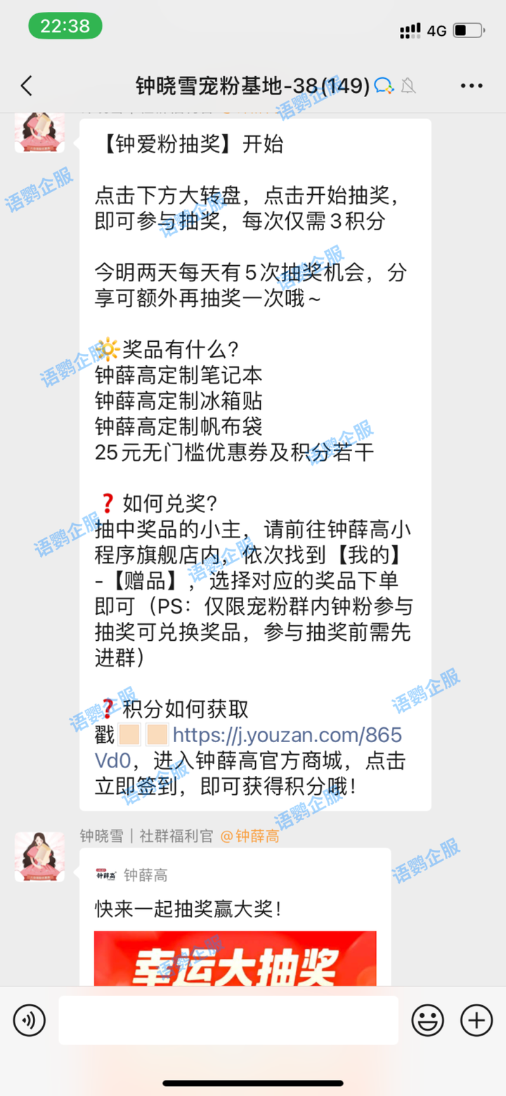 以上就是关于《虎丫炒鸡如何通过抽奖玩法快速裂变涨粉到企业微信?私域抽奖玩法技巧有哪些?》的全部内容,私域抽奖活动除了能让客户产生购买欲望以外也能起到品牌推广和传播的作用,特别是配合语鹦企服的抽奖活动,效果更是立竿见影。想要了解更多,欢迎大家到语鹦企服官网学习体验!更多企业微信玩法,欢迎关注语鹦企服!