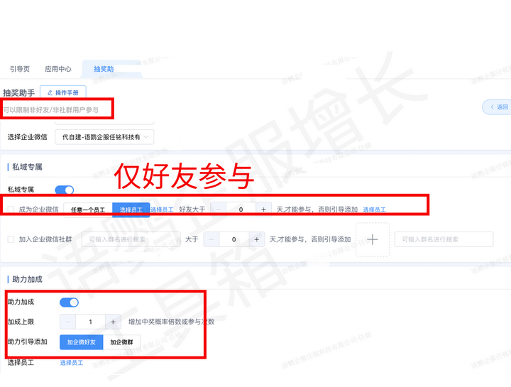 同时,语鹦企服的「大转盘&九宫格抽奖」工具的后台可以设置「仅好友参与」和「助力加成」功能,如果不是好友的话可以引导其成为好友,除此之外,如果本身就是好友,也有推荐好友参与则可多一次抽奖机会。
