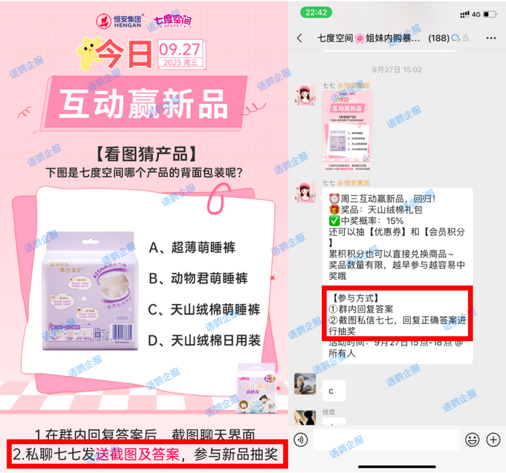 除了设置抽奖活动需要用户分享或者邀请好友参与,从而获得额外的抽奖机会,增加活动的裂变效果以外,还可以在设置为鼓励式互动,比如在群内参与互动就可或得抽奖机会,七度空间的社群经常举办群发互动则可参与抽奖的活动,这样会增加用户之间的互动,提高活动的曝光度。