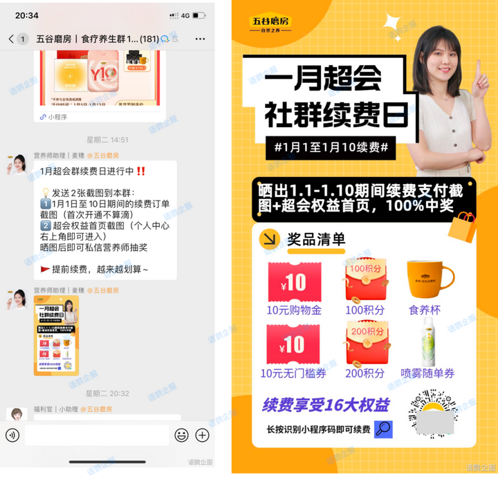 社群晒单得抽奖机会可以利用社群的传播效用和用户的互动性,提升用户的转化率,在看到别人拿大奖之后也会刺激自己的消费欲望。比如五谷磨房的晒单得抽奖,100%中奖的活动会让客户产生提前续费的欲望。