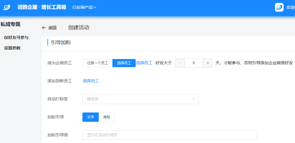 企业可以使用语鹦企服工具箱中的【仅好友参与】功能,在【引导加粉】板块中对参与活动的客户进行条件限制。通过这个功能,只有企业员工的好友才有资格参与活动,确保活动面向专属私域好友。