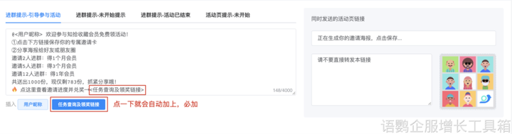 推荐企业可以使用语鹦企服的「社群裂变」功能,来实现不同邀请人数对应不同奖励的要求。在后台提前设置好「社群裂变」功能后,当客户扫码进群时,群聊会自动发送欢迎消息,同时鼓励客户积极参与活动,确保抽奖活动的引流效果。通过这种方式,企业可以更好地激励客户参与社群裂变活动,从而更高效地扩大私域流量池。