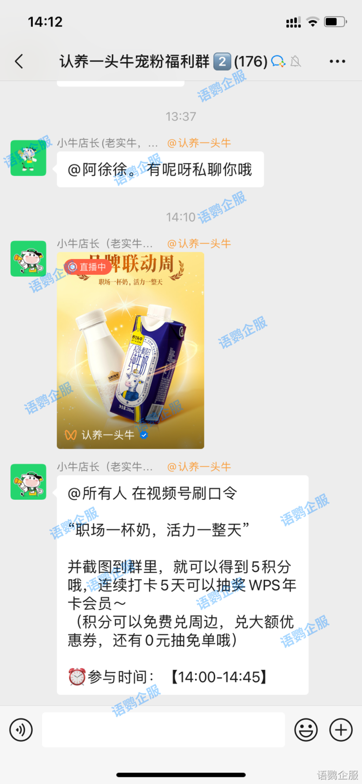 视频互动:可以通过社群转发视频号直播刷口令活动,比如认养一头牛在社群内发布活动通知,鼓励用户在规定时间内在直播评论区输入正确口令,有机会参与中奖抽奖,不同口令对应不同的奖项,如认养一头牛的牛奶、周边产品、折扣券等,这不仅促进社群互动,还提升视频号数据,加强用户交流,提高社群活跃度。