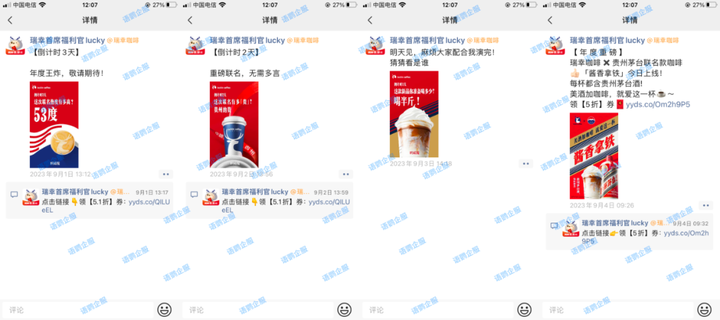 朋友圈分享: 在活动开始前,预热至关重要。以瑞幸咖啡为例,他们在朋友圈中使用倒计时的方式,提前3天、2天和1天进行预热,然后在活动开始当天发布通知。这样的策略有助于引发客户的兴趣和参与。