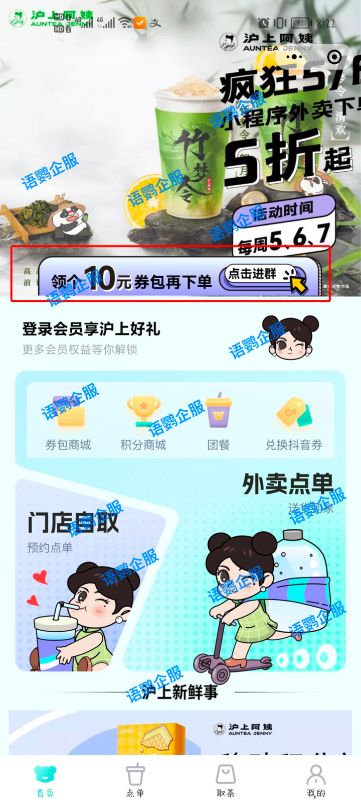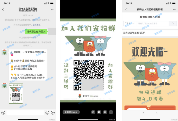 比如新式茶饮茶守艺就是利用语鹦企服的「定位进群」功能,在用户添加企微福利官后,触发系统自动发送的欢迎语和定位进群的海报,用户随后扫描二维码,打开搜索群聊页面,按照地区需求搜索并加入门店群聊的,进群之后领取折扣券。